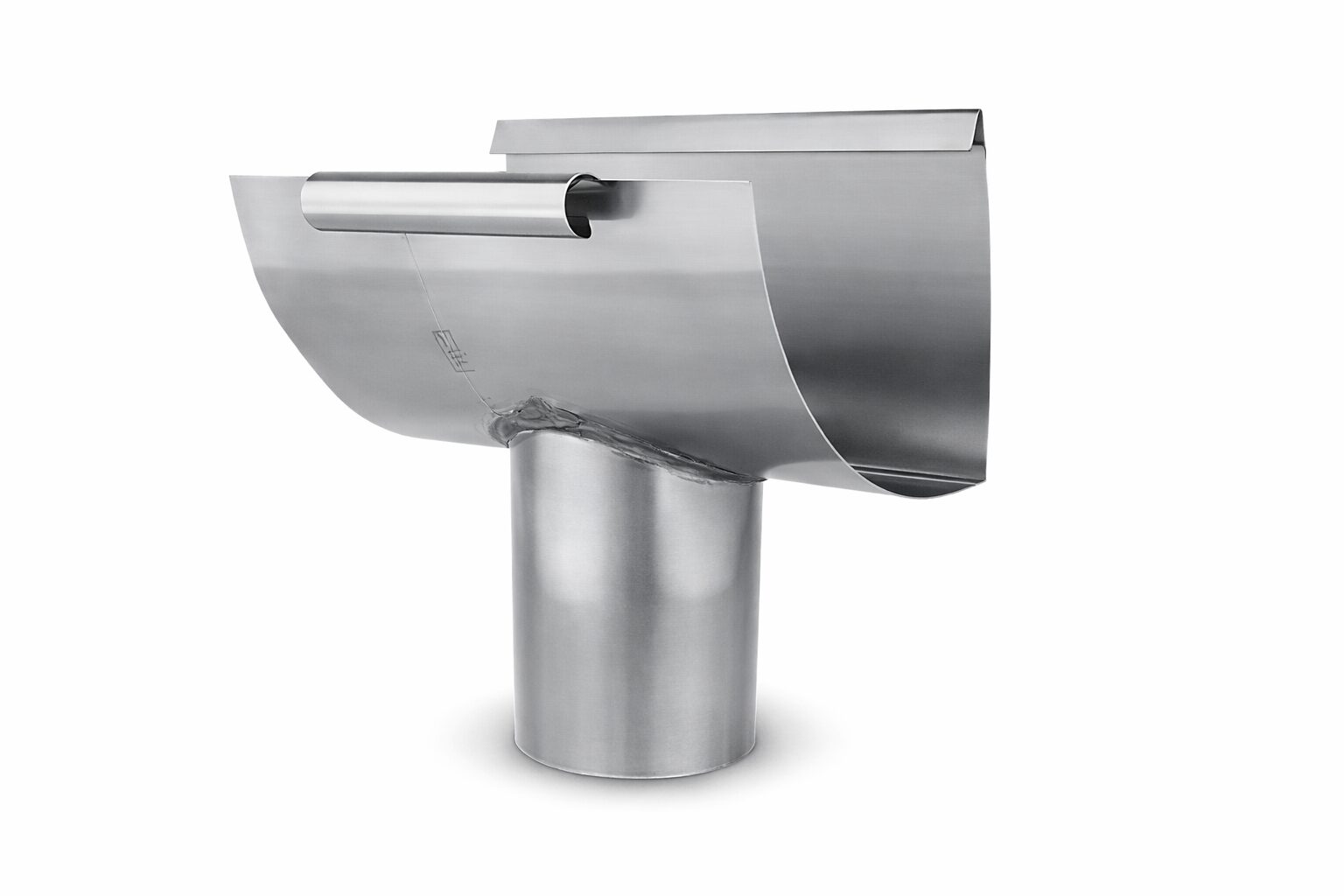 The half-round gutter with outlet is designed for efficient rainwater drainage and reliable connection to the downpipe. It is suitable for 333 mm and 400 mm half-round gutters and manufactured as a bonded model with a soldered outlet, ensuring a durable and watertight joint.